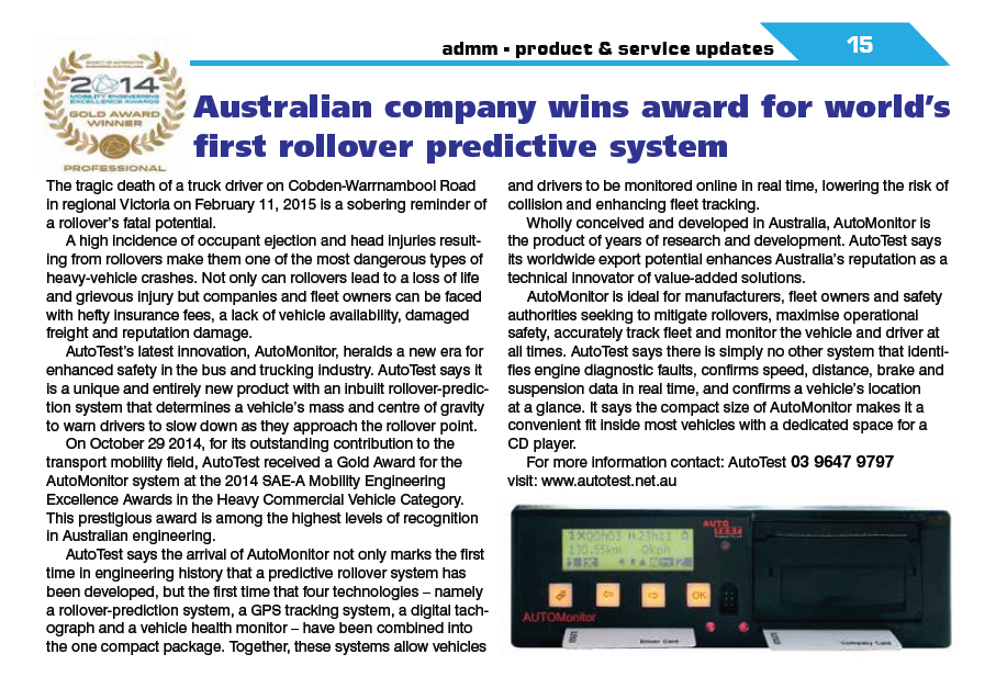 AutoMonitor from AutoTest uniquely incorporates three vehicle information and safety technologies including tachograph vehicle dynamics, and GPS-based tracking into one easy to use device. AutoMonitor is a compact, all in one, space saving dash mounted solution that enables the vehicle owner to track the vehicle, keep an electronic logbook and measure vehicle dynamics to provide outputs such as brake and suspension condition, driving hours and over-speeding. Data logged can be securely accessed via internet, or downloaded directly to a PC via communication port.